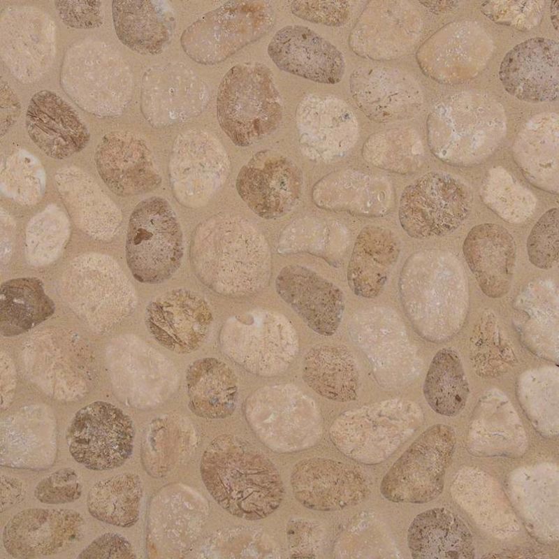 - Travertine Pebbles Blend Tile is a beautiful natural looking travertine mesh-backed backsplash tile that blends shades of soft brown together to create warmth and character. The pebbles are all different shapes that fit together in a cohesive style, making this an excellent choice for any bathroom or kitchen. This tile can be used on the wall, on the countertop, and even on the floor or as a shower surround.
